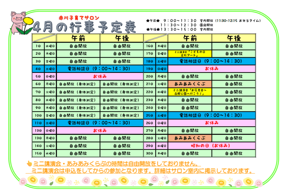 2025.12.25子育てサロン 4月の行事予定です。🌸🐣