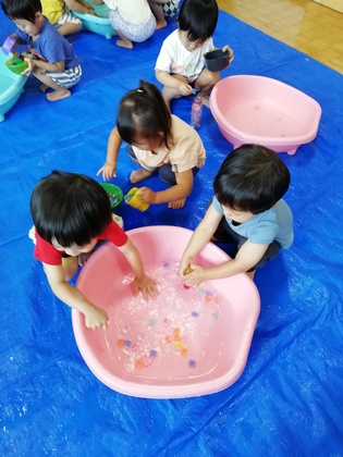 気温が高いので室内で水遊びをしました。ビーズすくいをしたり、コップに水を入れて器に移し替えたりなど涼しく過ごしていました。
