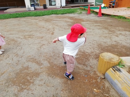 スイカわりをしました。目隠しをして、そーっとスイカがある方へ近づいて棒を思いっきり振り下ろします!なかなかスイカを見つけられず周りにいるお友だちから「そっちじゃない!!!!こっちーーーー!」とたくさん声をかけられスイカわりを楽しんでいました。