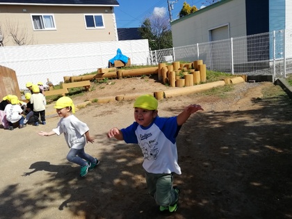 園庭で大好きな鬼ごっこ!逃げろ~~~!!!すごい速さで逃げ回っています。この調子で運動会も頑張って走ろうね。
