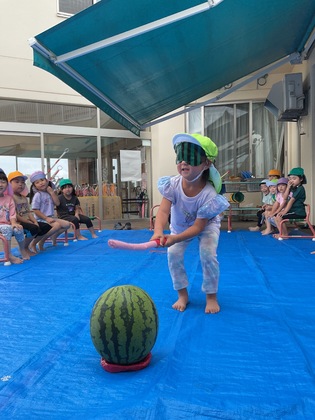スイカわりをしました。目隠しをして、そーっとスイカがある方へ近づいて棒を思いっきり振り下ろします!なかなかスイカを見つけられず周りにいるお友だちから「そっちじゃない!!!!こっちーーーー!」とたくさん声をかけられスイカわりを楽しんでいました。