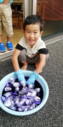 ひまわりさんは運動会でおそろいで着るTシャツを染めました。みんなで話し合い、いろんな色の候補があがりましたが今年は紫に決まりました。さて。どんな模様に染まっているか完成が楽しみです。