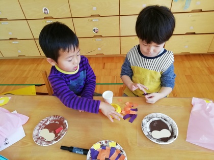 秋の制作に真剣に取り組む2人。フクロウを作っています。色とりどりの羽を考えながら貼り付けています。