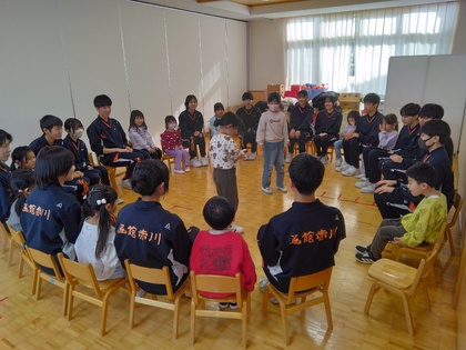 赤川中学校の3年生が遊びに来てくれました。最後はみんなでリーダー探しゲームなどをしました。一緒に遊んでもらって大喜びなひまわりぐみさんでした。
