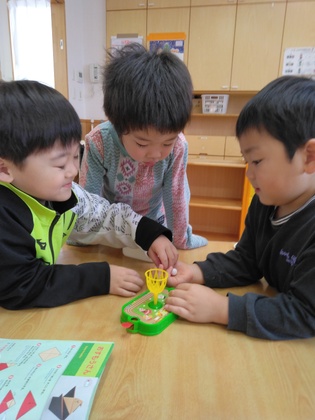 3人で頭を寄せ合ってなかよく遊んでいます。遊びの中には年齢が上がるにつれ、ルールなどが増えていきますが上手に遊んでいました。