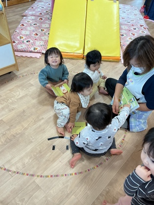 絵本を読んでもらうのが大好きな子どもたち。「読んで~」と行列ができます。保育教諭の言葉をオウム返しするのが上手になりました!