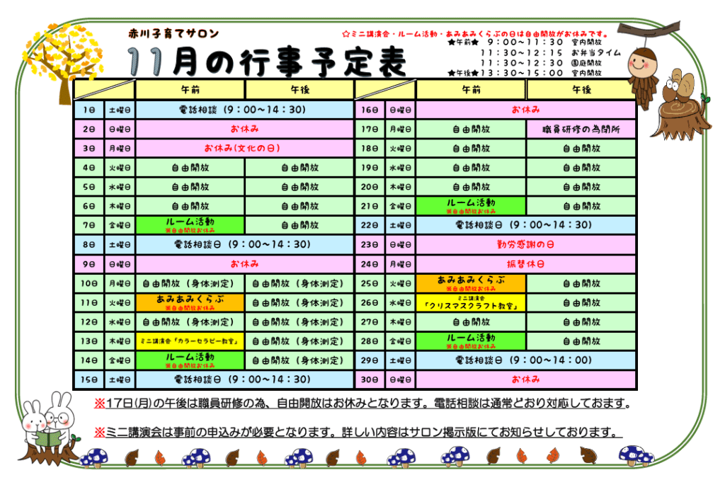子育てサロン 11月の行事予定です。🍄