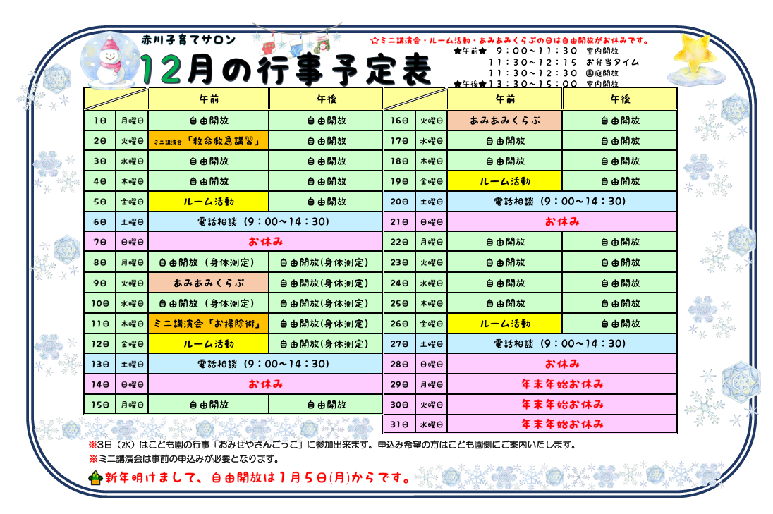 | 9:00~11:30 室内開放 | 11:30~12:30 園庭開放 | 13:30~15:30 | |